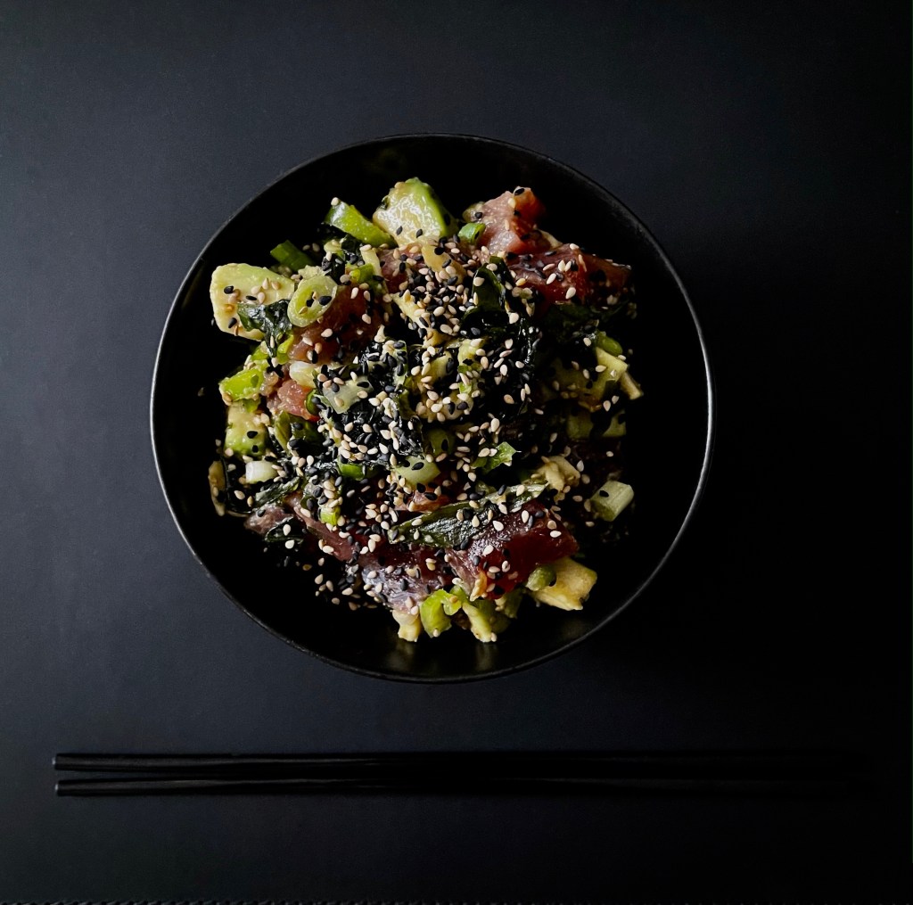 If you can’t get ahi (Hawaiian for yellow-fin and not to be confused with hamachi yellow-tail/amberjack) just make sure whatever tuna you use is certified sushi/sashimi grade: the process involved is not complicated but guarantees what you have purchased is fit for consuming raw – flash frozen for a specific time at a temp well below the capabilities of a home freezer to get rid of parasites. Now there’s a thought.